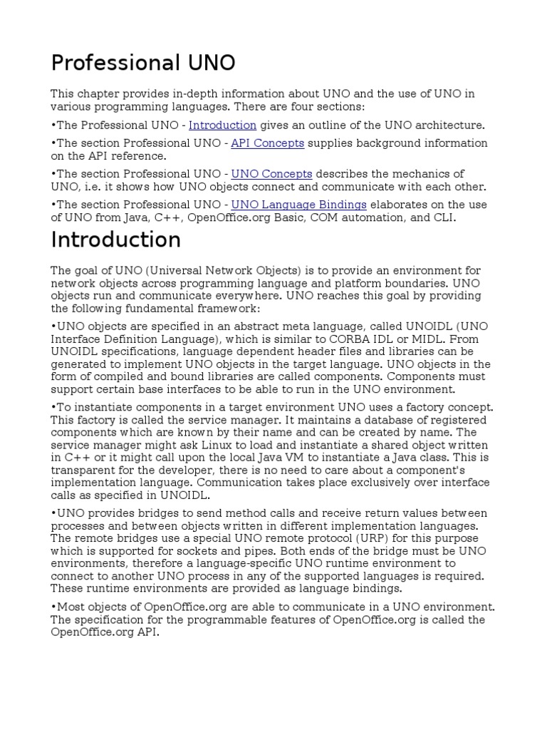 This chapter provides in-depth information about UNO and the use of UNO in various programming languages. There are four sections: The Professional UNO - Introduction gives an outline of the UNO architecture. The section Professional UNO - API Concepts supplies background information on the API reference. The section Professional UNO - UNO Concepts describes the mechanics of UNO, i.e. it shows how UNO objects connect and communicate with each other. The section Professional UNO - UNO Language Bindings elaborates on the use of UNO from Java, C++, OpenOffice.org Basic, COM automation, and CLI.