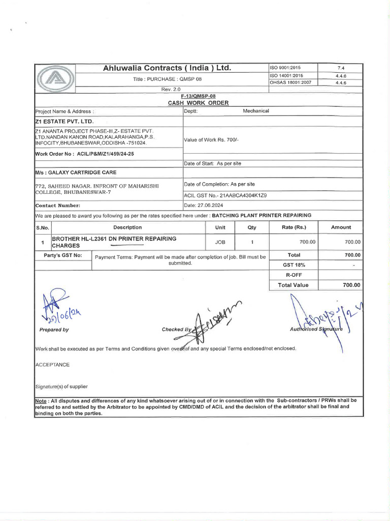 We are pleased to award you following as per the rates specified here under : BATCHING PLANT PRINTER REPAIRING