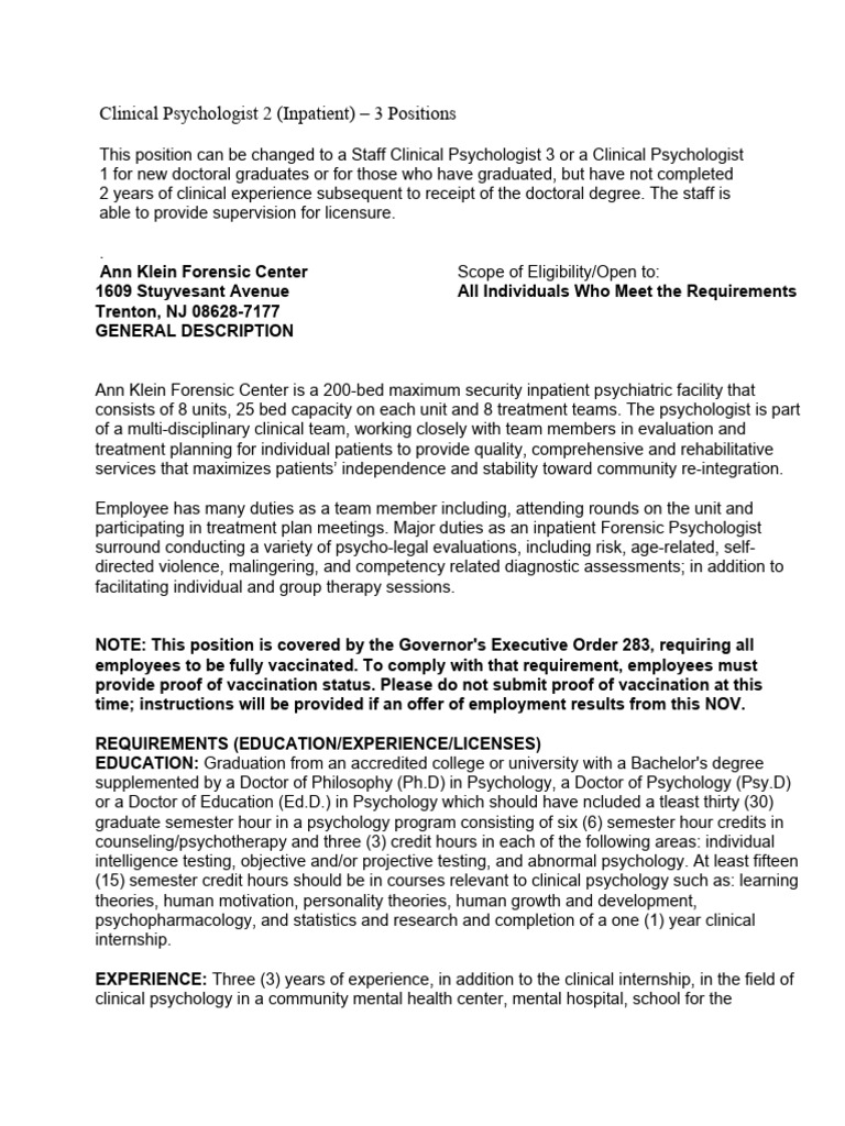 This position can be changed to a Staff Clinical Psychologist 3 or a Clinical Psychologist