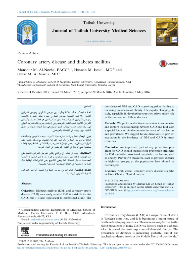 298(10): 1189e1195. Al Nozha OM. Coronary artery disease and diabetes