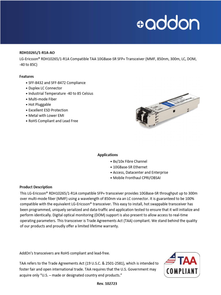 operating parameters. This transceiver is Trade Agreements Act (TAA) compliant. We stand behind the quality