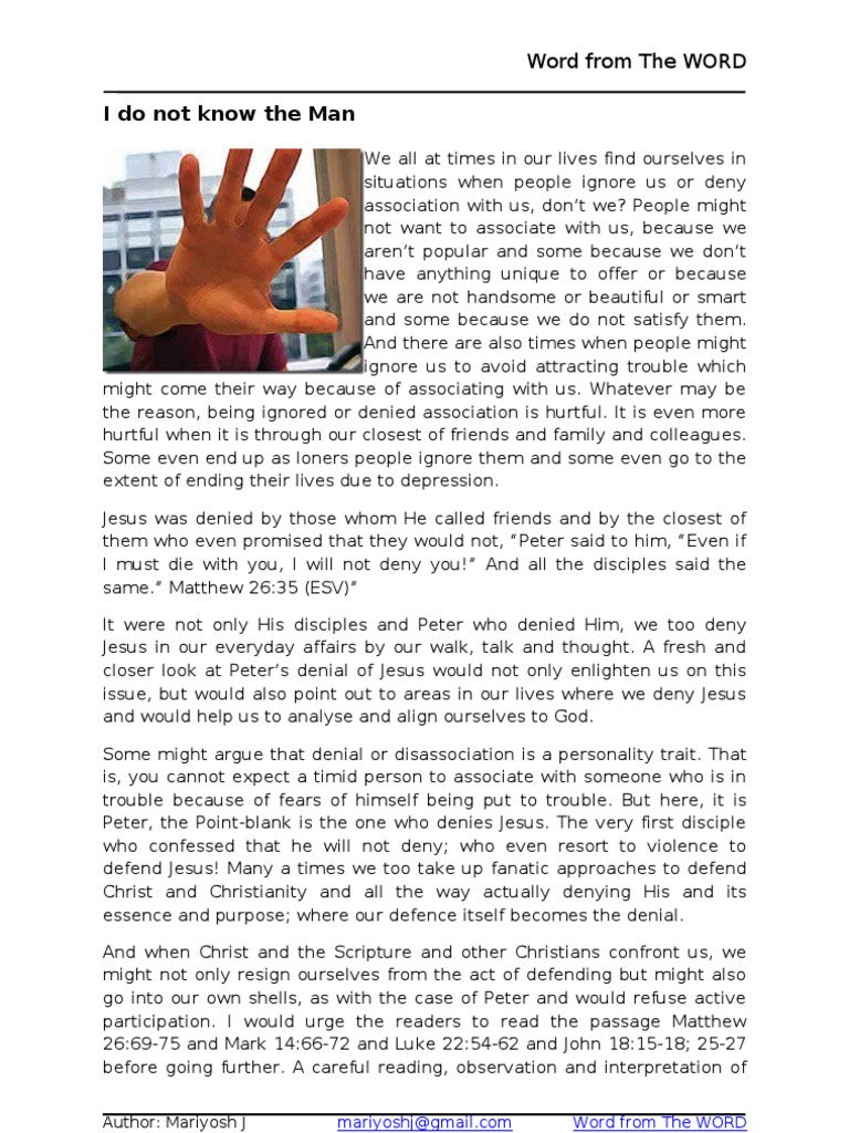 We all at times in our lives find ourselves in situations when people ignore us or deny association with us, dont we? People might not want to associate with us, because we arent popular and some because we dont have anything unique to offer or because we are not handsome or beautiful or smart and some because we do not satisfy them. And there are also times when people might ignore us to avoid attracting trouble which might come their way because of associating with us. Whatever may be the reason, being ignored or denied association is hurtful. It is even more hurtful when it is through our closest of friends and family and colleagues. Some even end up as loners people ignore them and some even go to the extent of ending their lives due to depression. Jesus was denied by those whom He called friends and by the closest of them who even promised that they would not, Peter said to him, Even if I must die with you, I will not deny you! And all the disciples said the same. Matthew 26:35 (ESV) It were not only His disciples and Peter who denied Him, we too deny Jesus in our everyday affairs by our walk, talk and thought. A fresh and closer look at Peters denial of Jesus would not only enlighten us on this issue, but would also point out to areas in our lives where we deny Jesus and would help us to analyse and align ourselves to God. Some might argue that denial or disassociation is a personality trait. That is, you cannot expect a timid person to associate with someone who is in trouble because of fears of himself being put to trouble. But here, it is Peter, the Point-blank is the one who denies Jesus. The very first disciple who confessed that he will not deny; who even resort to violence to defend Jesus! Many a times we too take up fanatic approaches to defend Christ and Christianity and all the way actually denying His and its essence and purpose; where our defence itself becomes the denial. And when Christ and the Scripture and other Christians confront us, we might not only resign ourselves from the act of defending but might also go into our own shells, as with the case of Peter and would refuse active participation. I would urge the readers to read the passage Matthew 26:69-75 and Mark 14:66-72 and Luke 22:54-62 and John 18:15-18; 25-27 before going further. A careful reading, observation and interpretation of