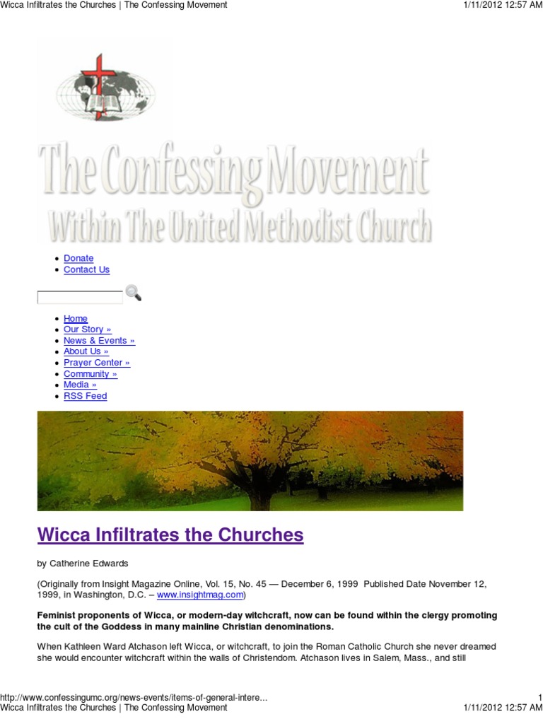 by Catherine Edwards (Originally from Insight Magazine Online, Vol. 15, No. 45 December 6, 1999 Published Date November 12, 1999, in Washington, D.C. www.insightmag.com) Feminist proponents of Wicca, or modern-day witchcraft, now can be found within the clergy promoting the cult of the Goddess in many mainline Christian denominations. When Kathleen Ward Atchason left Wicca, or witchcraft, to join the Roman Catholic Church she never dreamed she would encounter witchcraft within the walls of Christendom. Atchason lives in Salem, Mass., and still