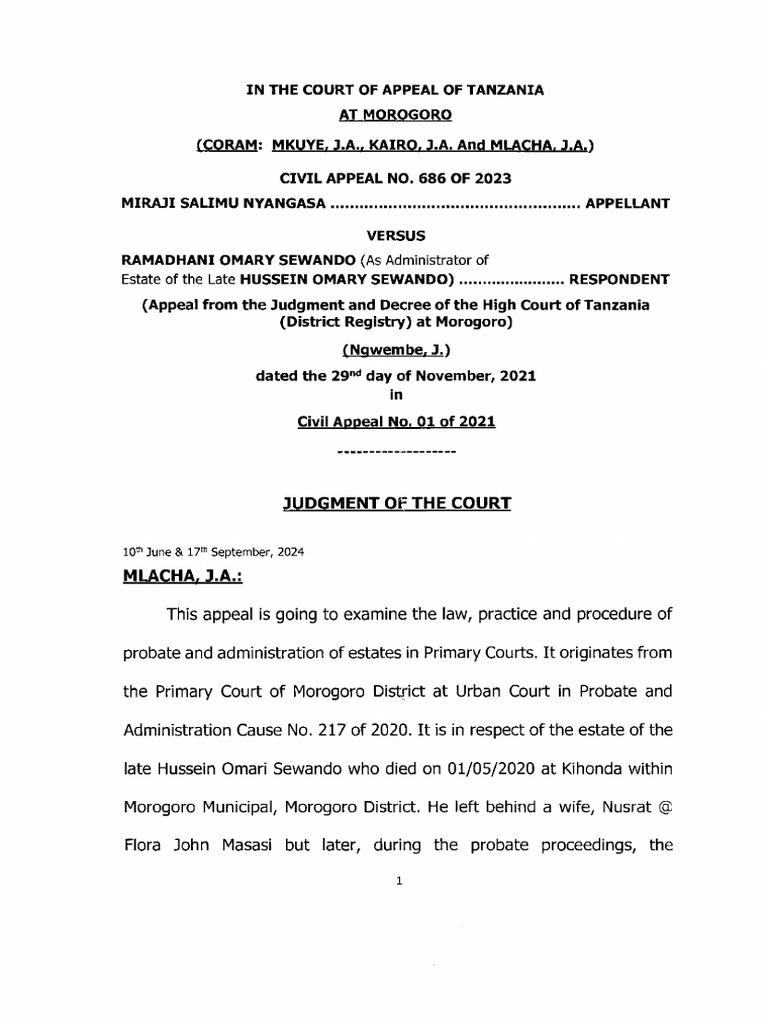 Miraji Salimu Nyangasa Vs Ramadhani Omary Sewando (As Administrator of Estate of The Late Hussein Omary Sewando) 2024 TZCA 895 (17 September 2024)