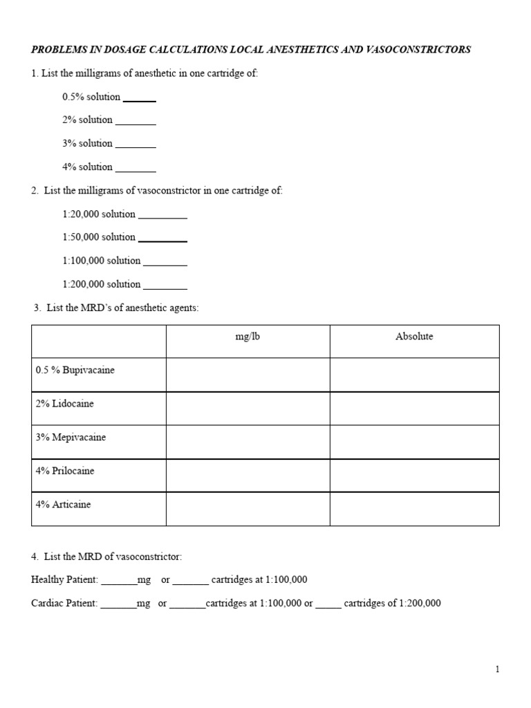 PROBLEMS IN DOSAGE CALCULATIONS LOCAL ANESTHETICS AND VASOCONSTRICTORS