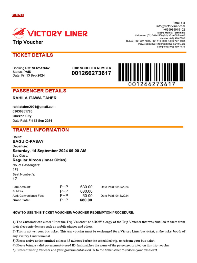 2) This is not yet your bus ticket. This trip voucher must be exchanged for a Victory Liner bus ticket, at the ticket booth of