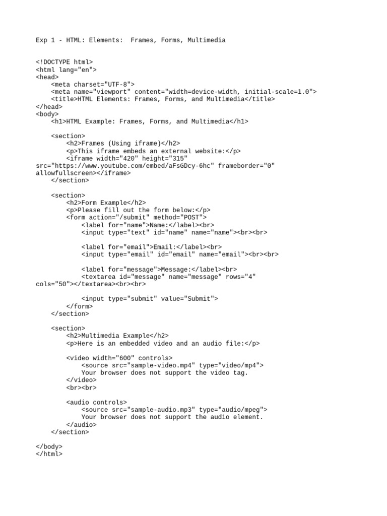 Exp 1 - HTML: Elements: Frames, Forms, Multimedia