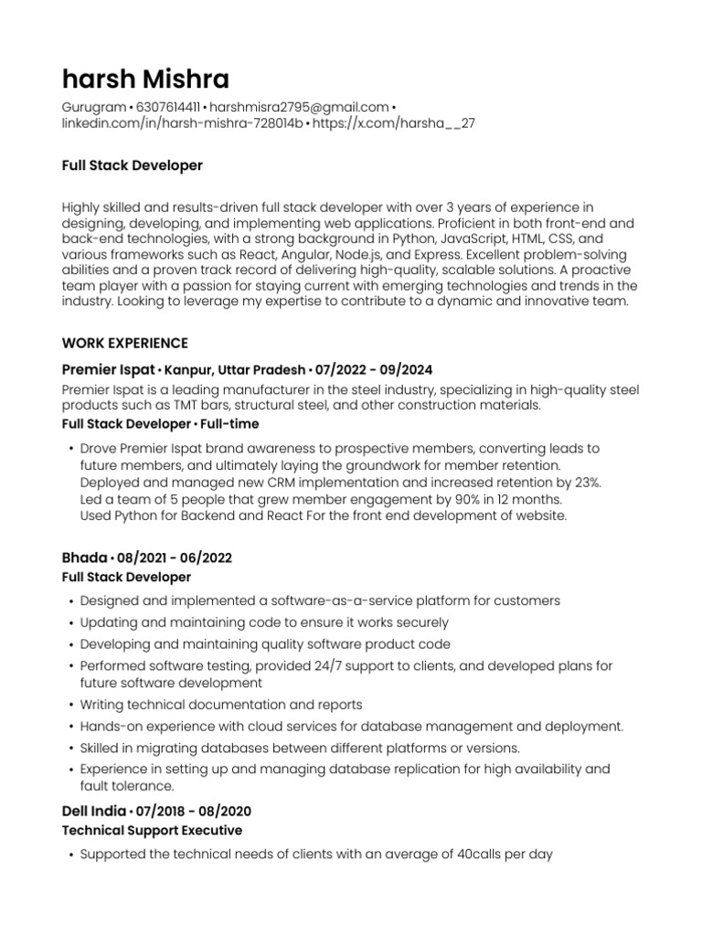 Highly skilled and results-driven full stack developer with over 3 years of experience in