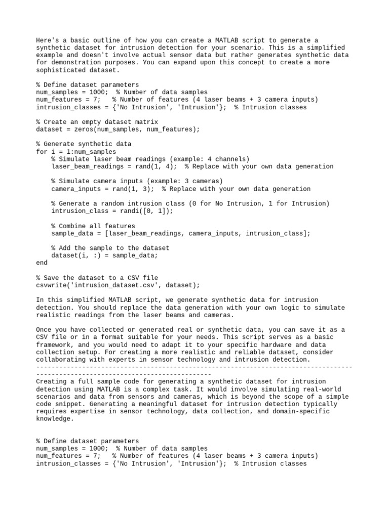 In this simplified MATLAB script, we generate synthetic data for intrusion