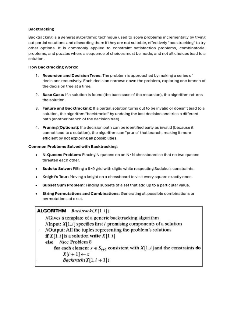 Backtracking is a general algorithmic technique used to solve problems incrementally by trying