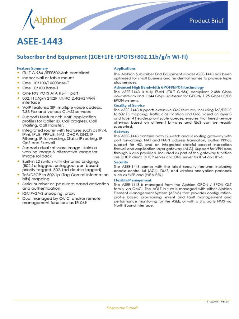 ITU-T G.984 /IEEE802.3ah compliant The Alphion Subscriber End Equipment Model ASEE-1443 has been
