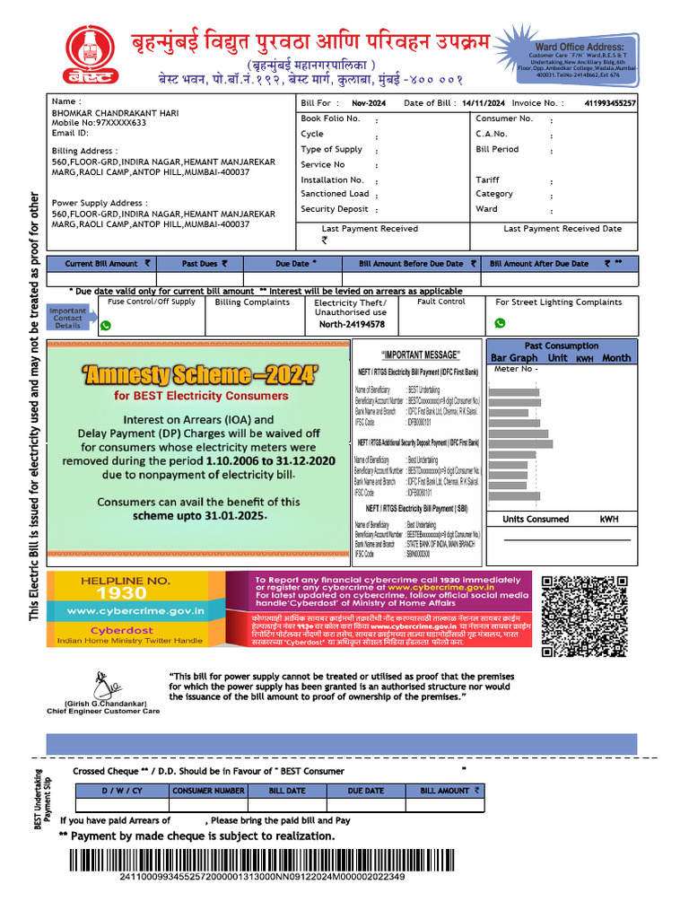 Name : Bill For : Nov-2024 Date of Bill : 14/11/2024 Invoice No. : 411993455257
