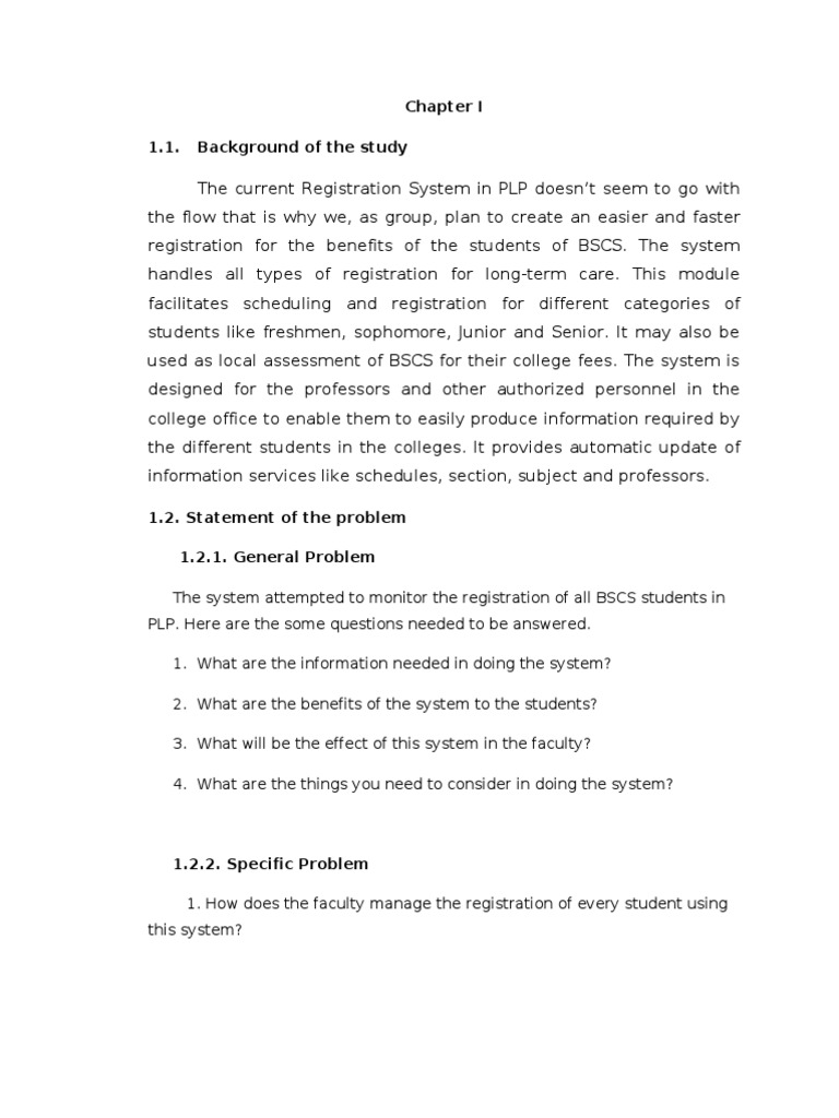 1.2. Statement of the problem 1.2.1. General Problem The system attempted to monitor the registration of all BSCS students in PLP. Here are the some questions needed to be answered. 1. What are the information needed in doing the system? 2. What are the benefits of the system to the students? 3. What will be the effect of this system in the faculty? 4. What are the things you need to consider in doing the system?