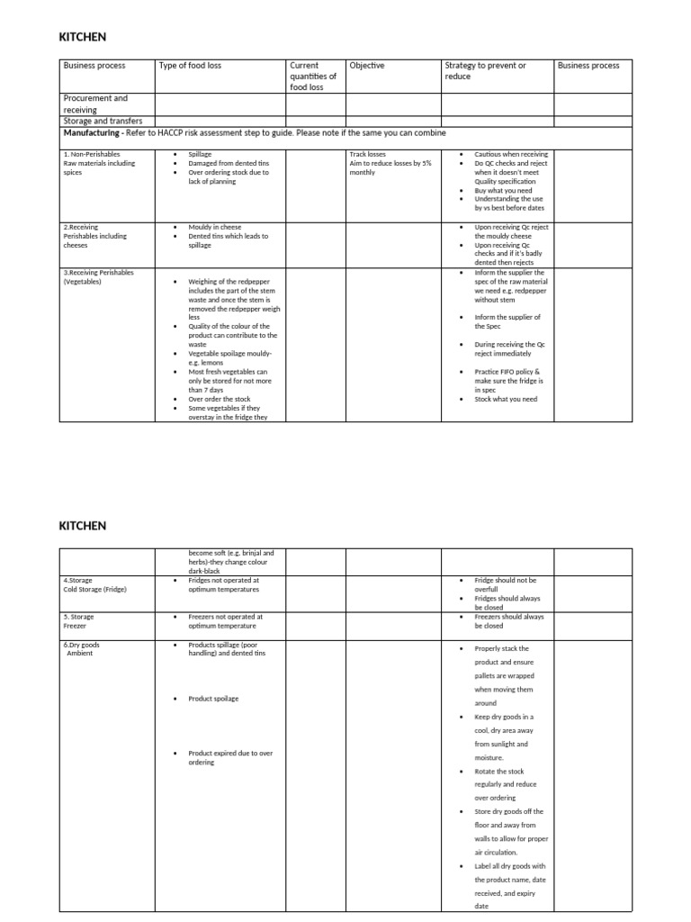 Business process Type of food loss Current Objective Strategy to prevent or Business process