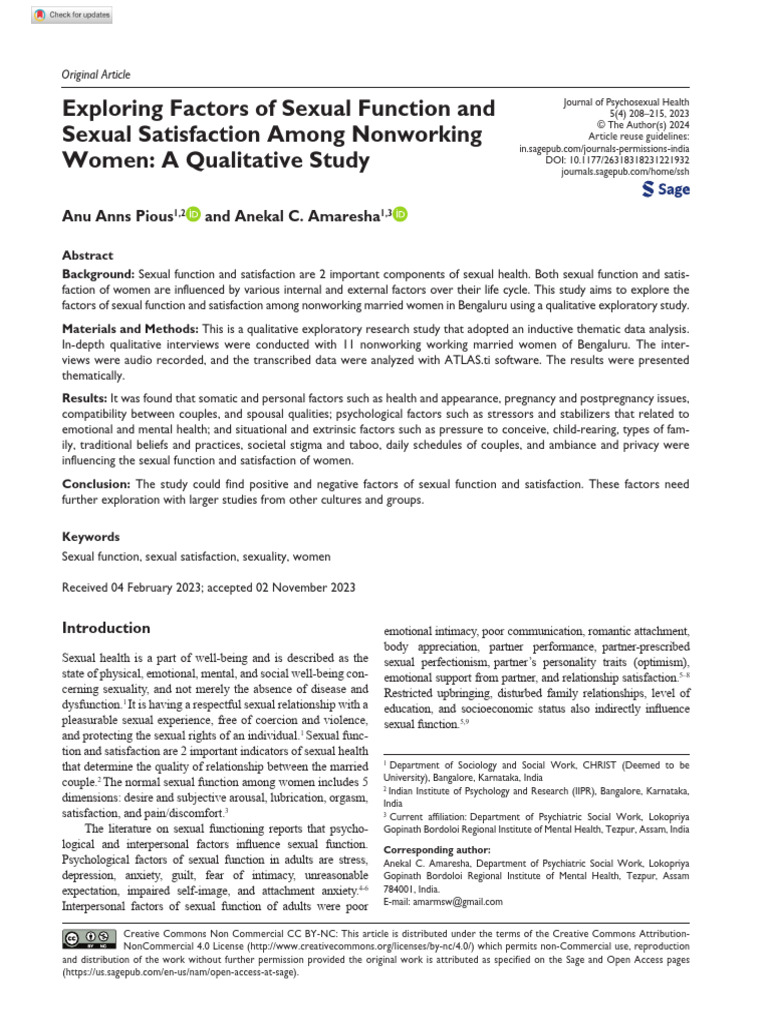 factors of sexual function and satisfaction among nonworking married women in Bengaluru using a qualitative exploratory study.
