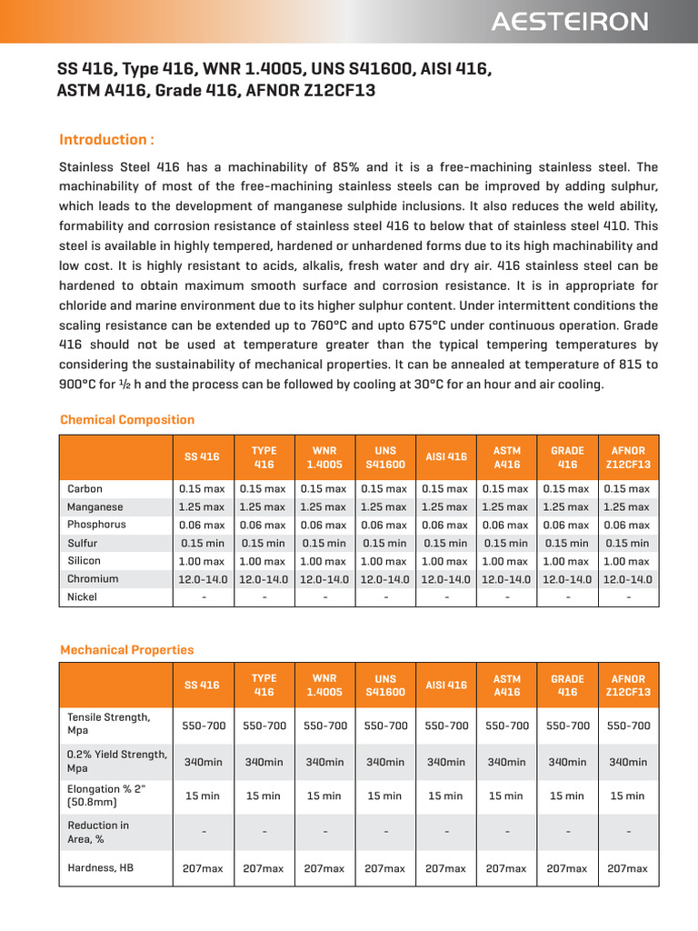 • Grade 416 steels are highly resistant to acids, alkalis, fresh water and dry air.