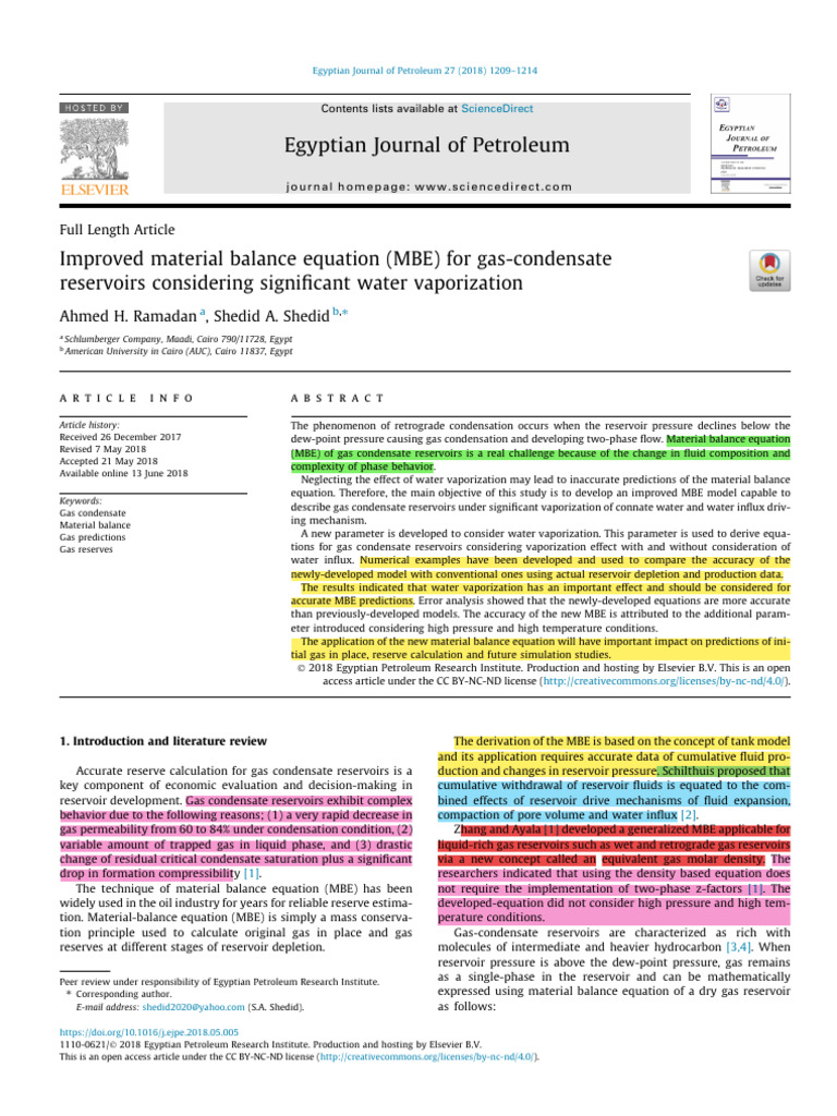 Peer review under responsibility of Egyptian Petroleum Research Institute.               as a single-phase in the reservoir and can be mathematically