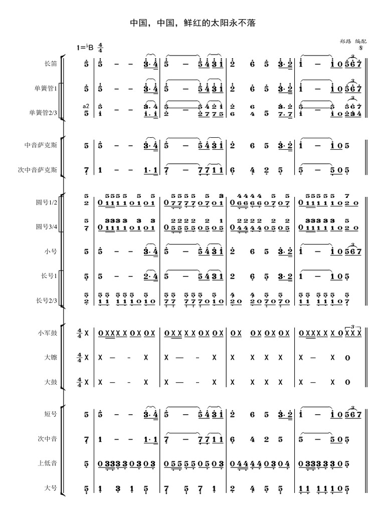 A0088.中国,中国,鲜红的太阳永不落 简谱 管乐总谱+分谱 ¥40元