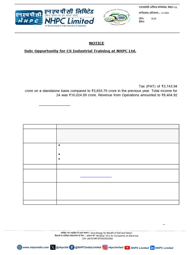 Sub: Oppurtunity for CS Industrial Training at NHPC Ltd.