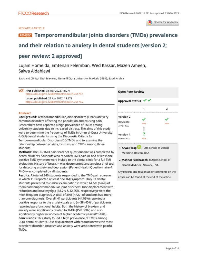 How to cite this article: Homeida L, Felemban E, Kassar W et al. Temporomandibular joints disorders (TMDs) prevalence and their