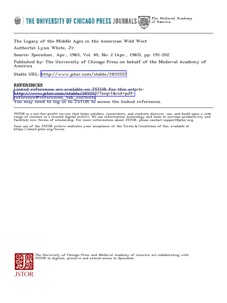 Lynn White Junior, The Legacy of The Middle Ages in The American Wild West