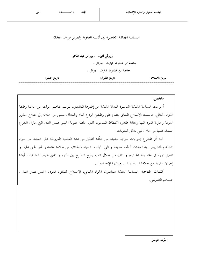 السياسة الجنائية المعاصرة بين أنسنة العقوبة وتطوير قواعد العدالة Contemporary Criminal Policy Between the Humanization of Punishment and the Development of the Justice Rules.