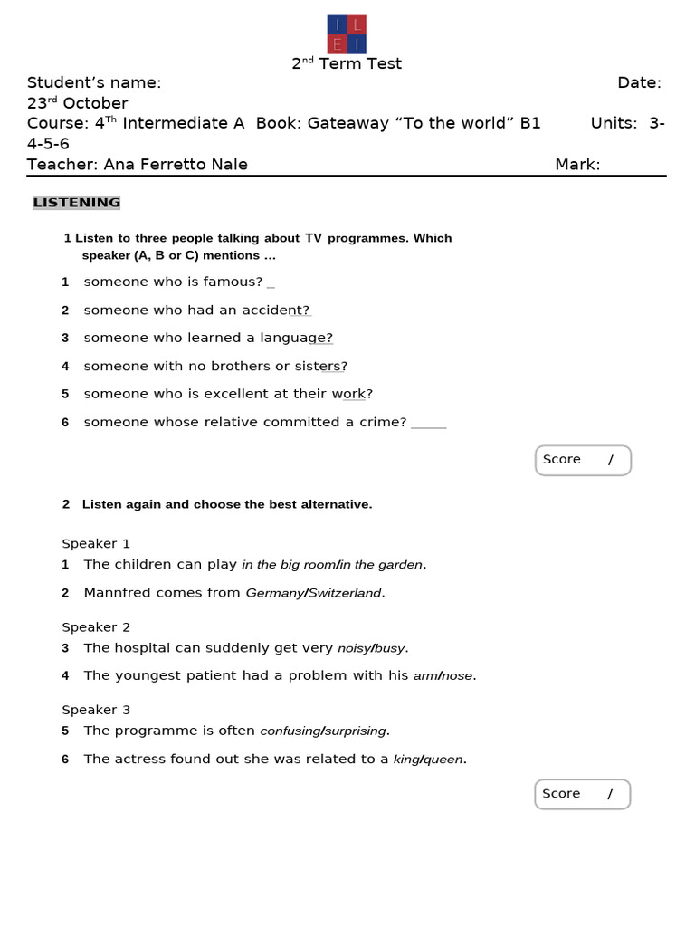 Course: 4Th Intermediate A Book: Gateaway “To the world” B1 Units: 3-