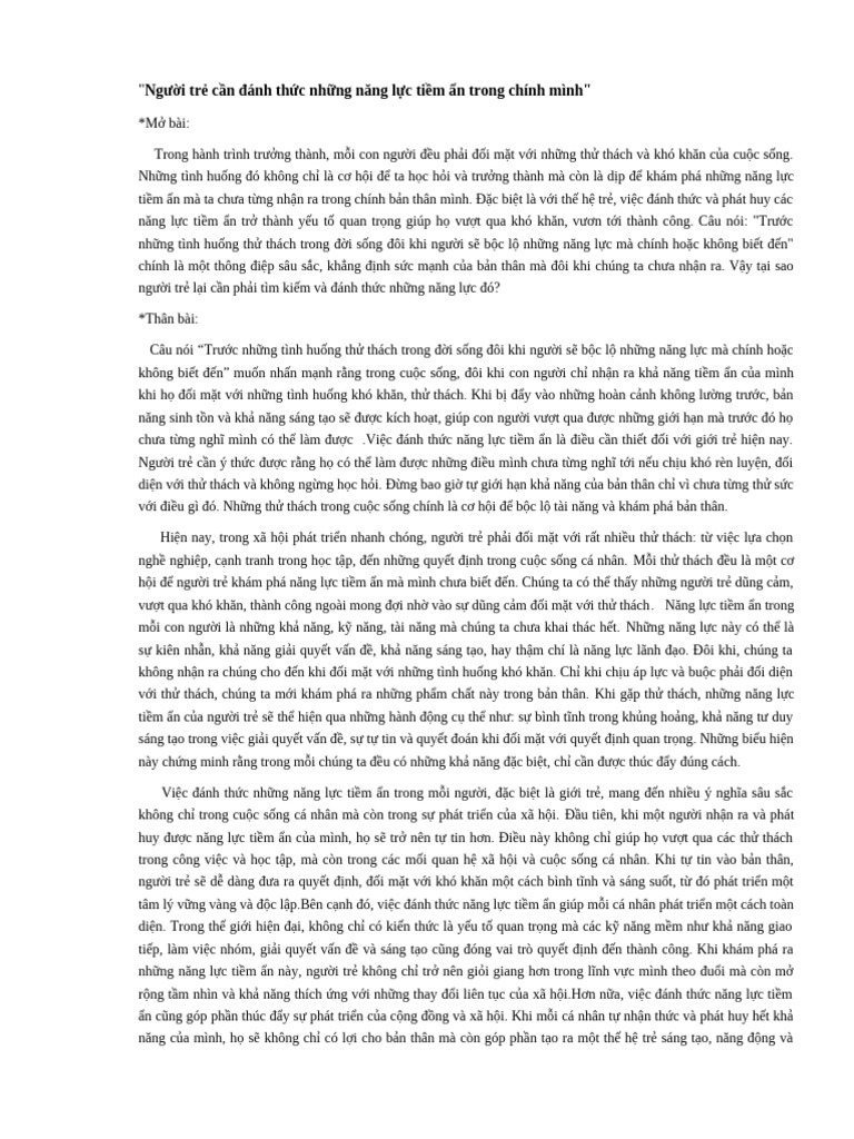 chưa từng nghĩ mình có thể làm được .Việc đánh thức năng lực tiềm ẩn là điều cần thiết đối với giới trẻ hiện nay.