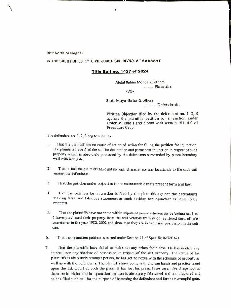 occasion in different paragraph of the written objection distinctly stated that the suit