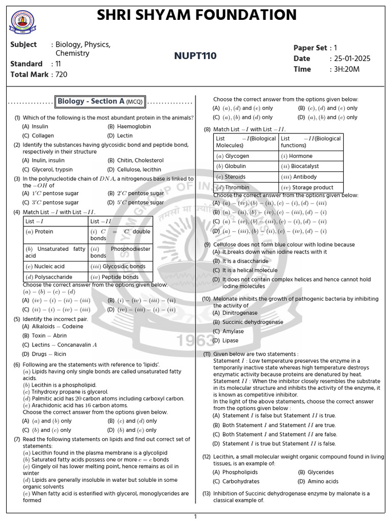 ................ Biology - Section A (MCQ) . . . . . . . . . . . . . . . . Choose the correct answer from the options given below: