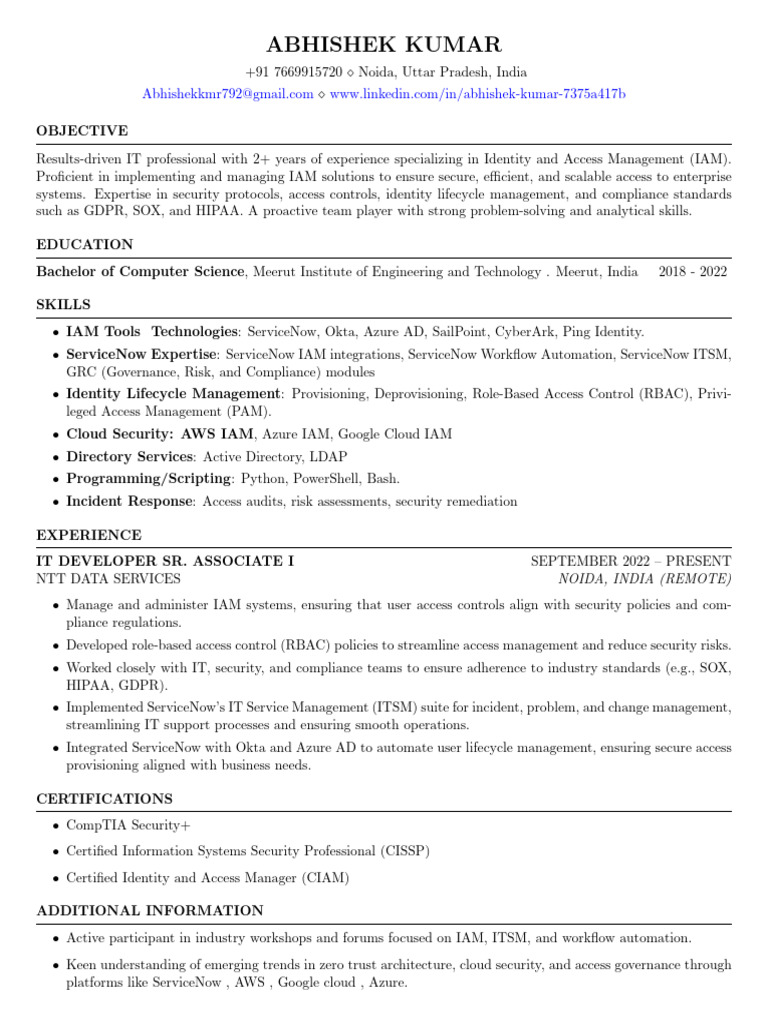 • ServiceNow Expertise: ServiceNow IAM integrations, ServiceNow Workflow Automation, ServiceNow ITSM,