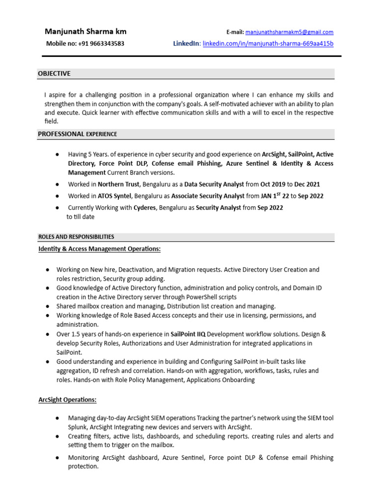 ● Worked in ATOS Syntel, Bengaluru as Associate Security Analyst from JAN 1ST 22 to Sep 2022