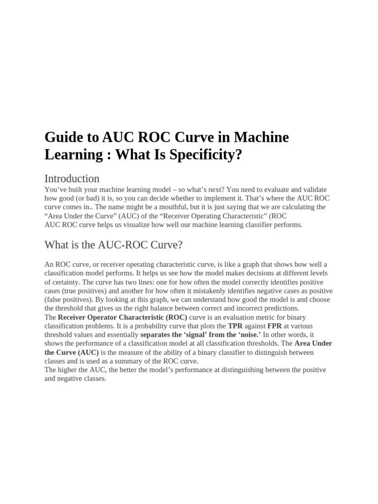 The document explains the AUC ROC curve, a crucial evaluation metric for binary classification models that visualizes the trade-off between true positive and false positive rates at various thresholds. It defines key terms such as AUC, ROC curve, sensitivity, specificity, and their importance in assessing model performance. The document emphasizes the significance of selecting appropriate thresholds to balance sensitivity and specificity for optimal classification results.