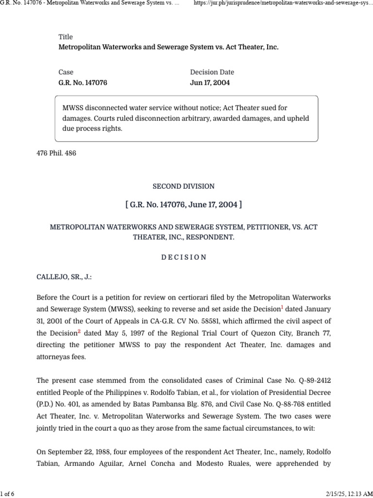 G.R. No. 147076 - Metropolitan Waterworks and Sewerage System vs. ... https://jur.ph/jurisprudence/metropolitan-waterworks-and-sewerage-sys...