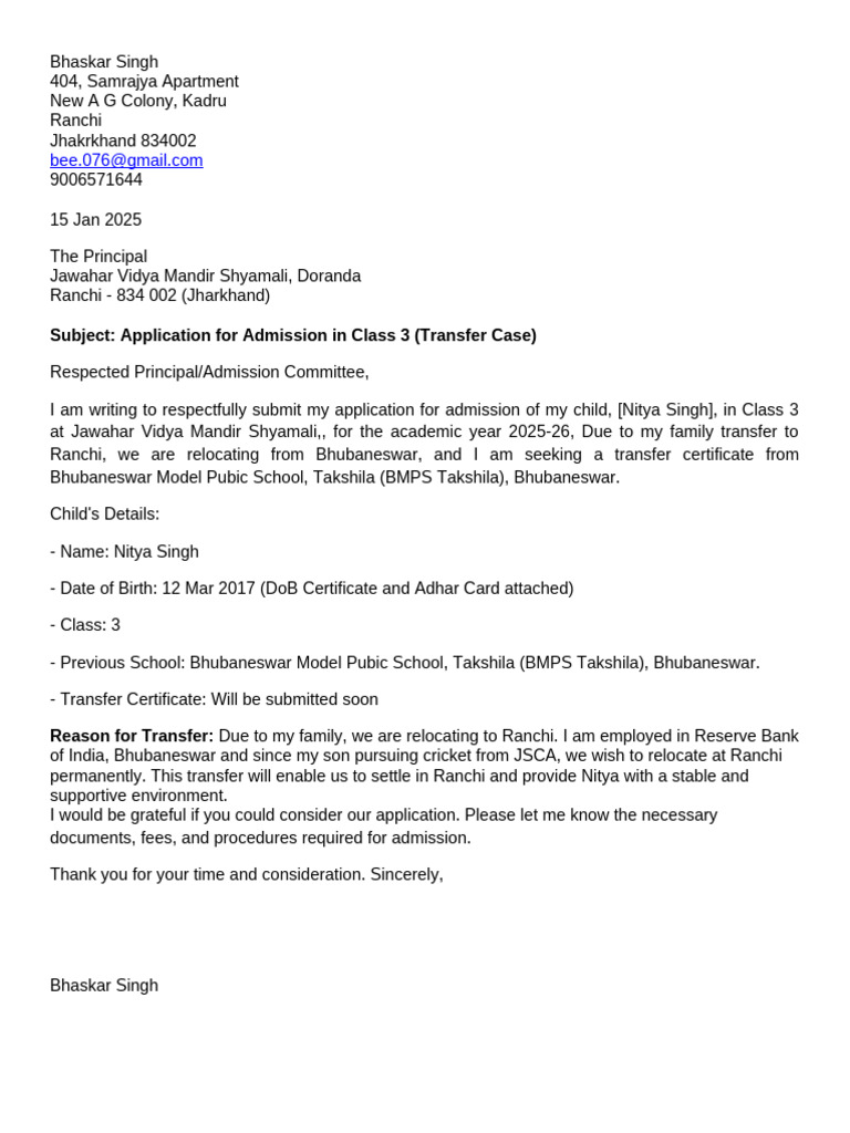 Bhaskar Singh is applying for admission of his child, Nitya Singh, to Class 3 at Jawahar Vidya Mandir Shyamali for the academic year 2025-26 due to a family relocation from Bhubaneswar to Ranchi. He requests a transfer certificate from the previous school and seeks information on the necessary documents and procedures for admission. The application emphasizes the need for a stable environment for Nitya as the family settles in Ranchi.
