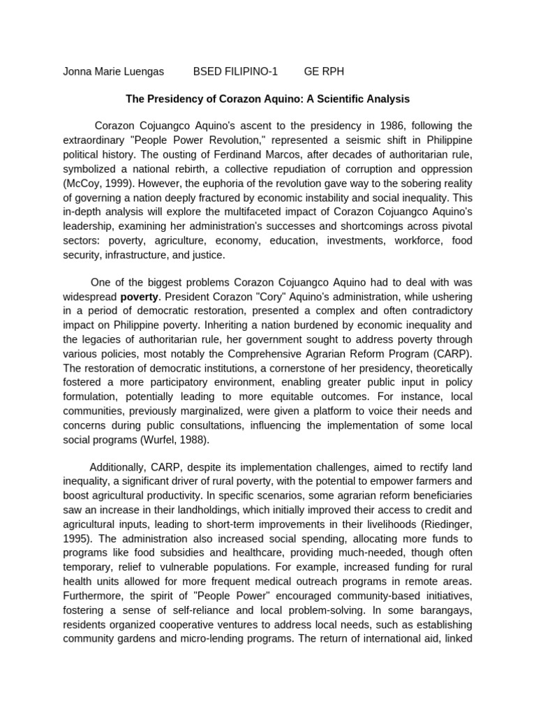 Cory Aquino Essay. Luengas, Jonna Marie N.