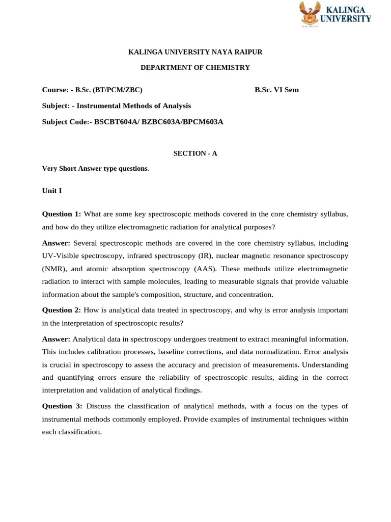 The document outlines the syllabus for the B.Sc. Instrumental Methods of Analysis course at Kalinga University, focusing on various analytical techniques including spectroscopic, chromatographic, and electroanalytical methods. It covers fundamental concepts, definitions, and applications of methods such as UV-Visible spectroscopy, mass spectrometry, and chromatography, along with their significance in analytical chemistry. Additionally, it discusses error analysis, the importance of detection methods, and the principles behind various analytical techniques.