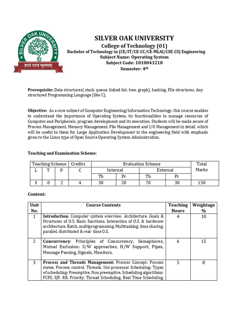 The document outlines the curriculum for a Bachelor of Technology course in Operating Systems at Silver Oak University, detailing prerequisites, course objectives, teaching and evaluation schemes, and course content. Key topics include process management, memory management, I/O management, security, and Unix/Linux operating system administration. The course also includes practical laboratory sessions and a list of recommended books and resources for further learning.