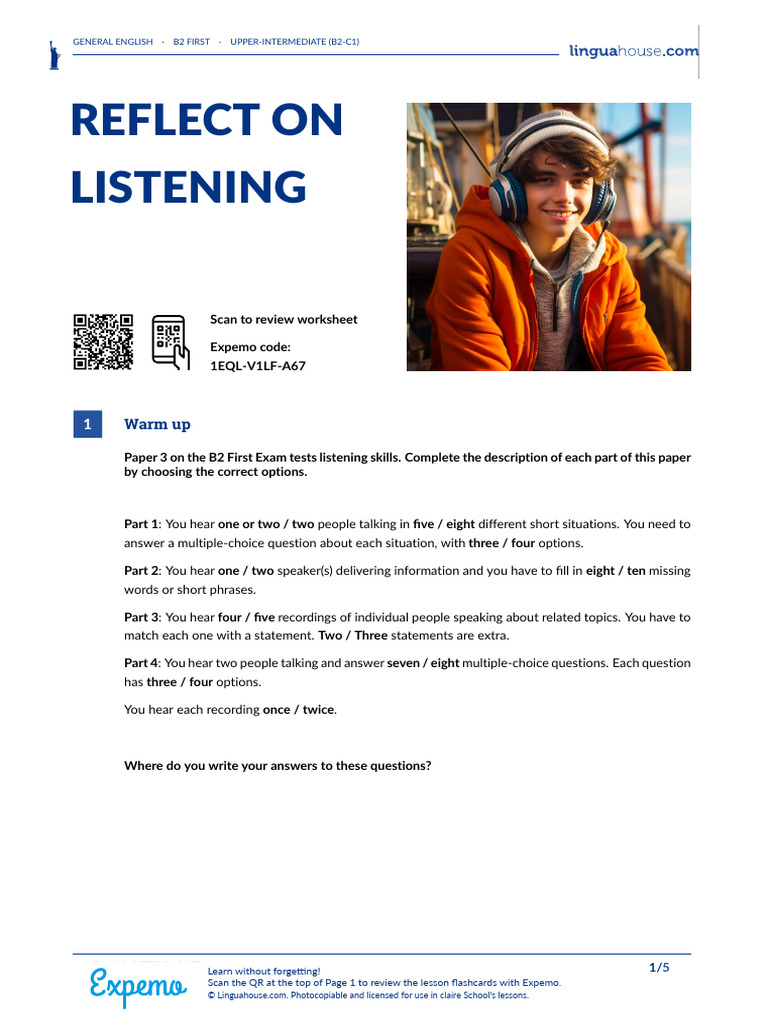 Complete the exercises. The first activity is a sample of part 2 of the Listening paper, and your teacher
