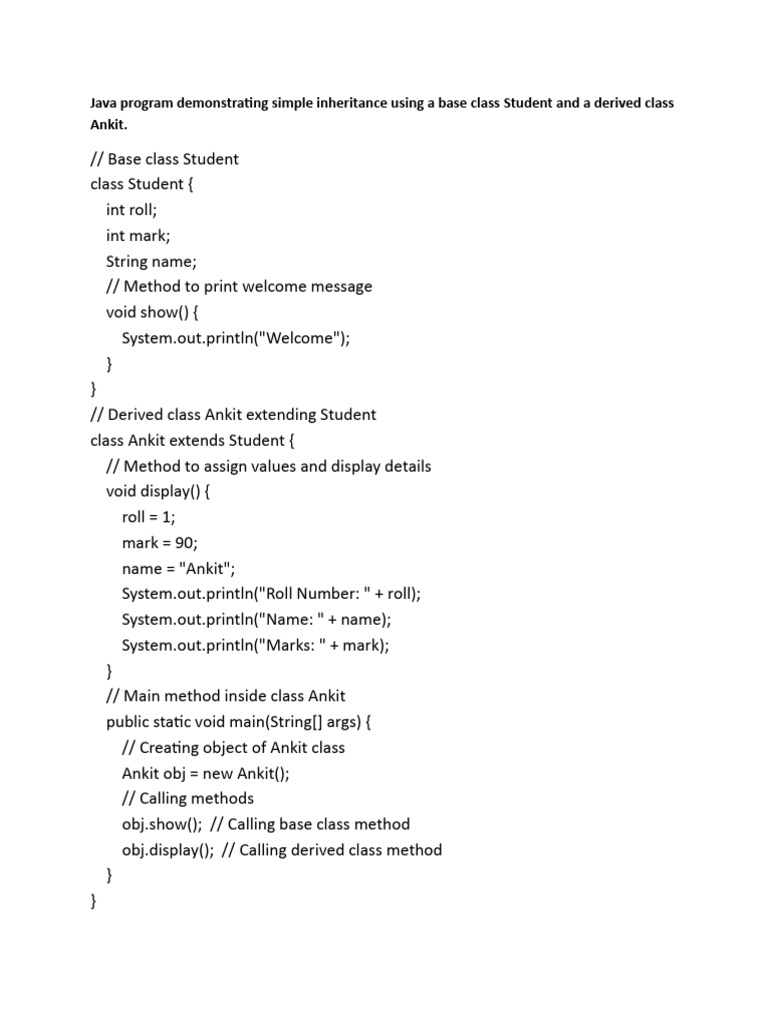 Java program demonstrating simple inheritance using a base class Student and a derived class