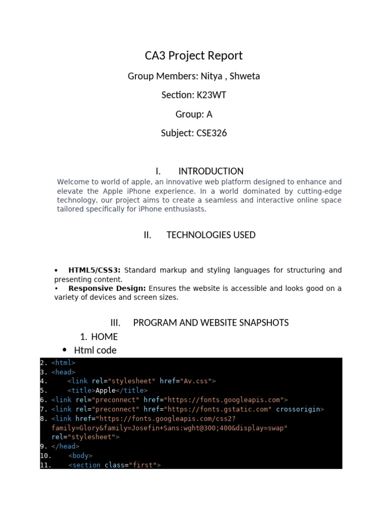 The CA3 Project Report presents an innovative web platform designed to enhance the Apple iPhone experience, created by group members Nitya and Shweta. It utilizes HTML5/CSS3 for structure and styling, ensuring responsive design for various devices. The report includes code snippets for the homepage and gallery, showcasing features like audio controls and a comprehensive gallery of iPhone models.