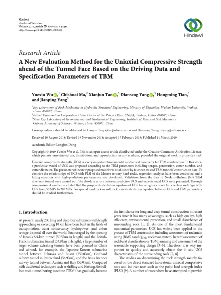 Shock and Vibration - 2019 - Wu - A New Evaluation Method For The Uniaxial Compressive Strength Ahead of The Tunnel Face