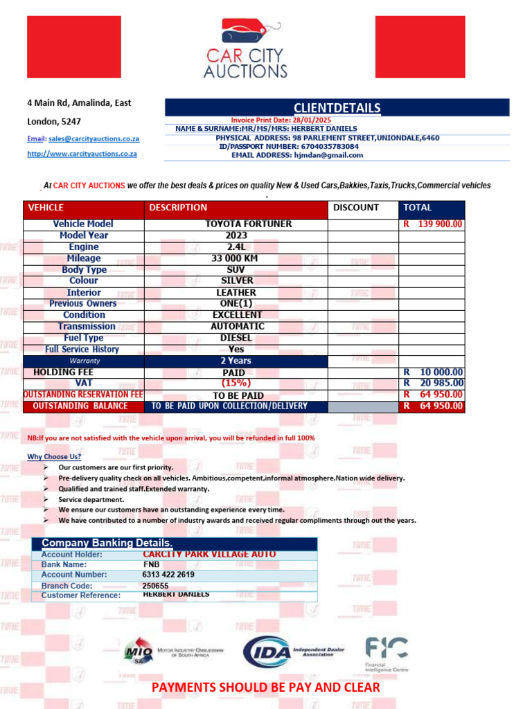 http://www.carcityauctions.co.za EMAIL ADDRESS: [email protected]