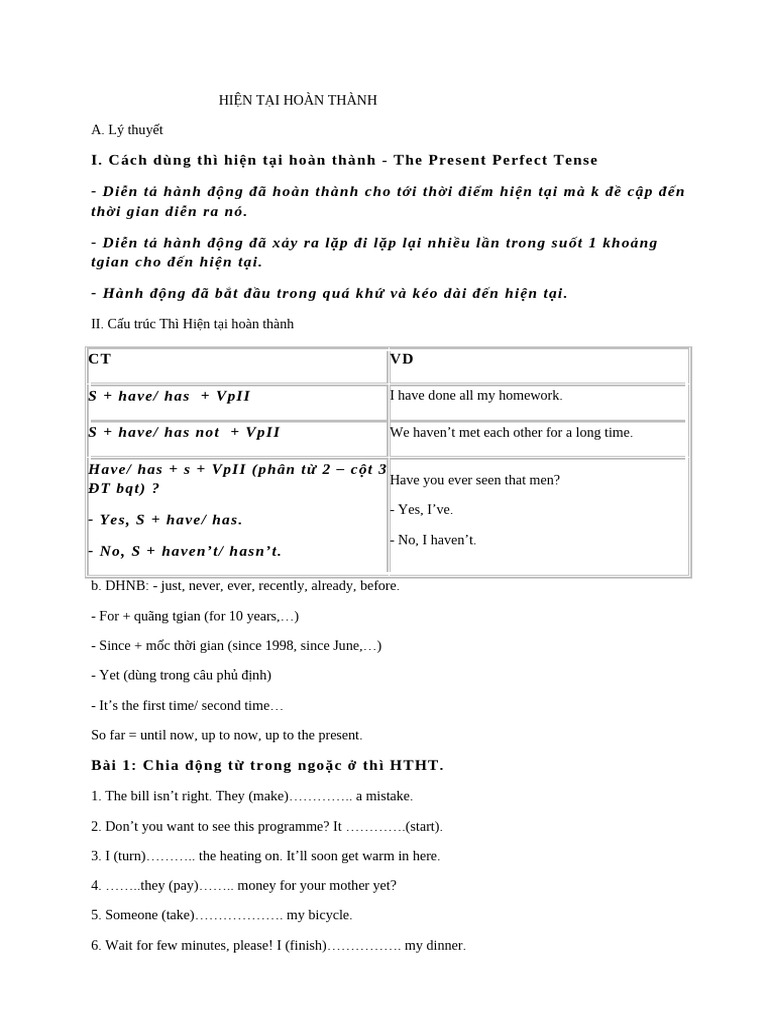 Bài 1: Chia động từ trong ngoặc ở thì HTHT.