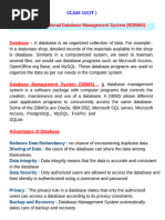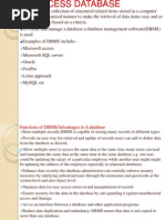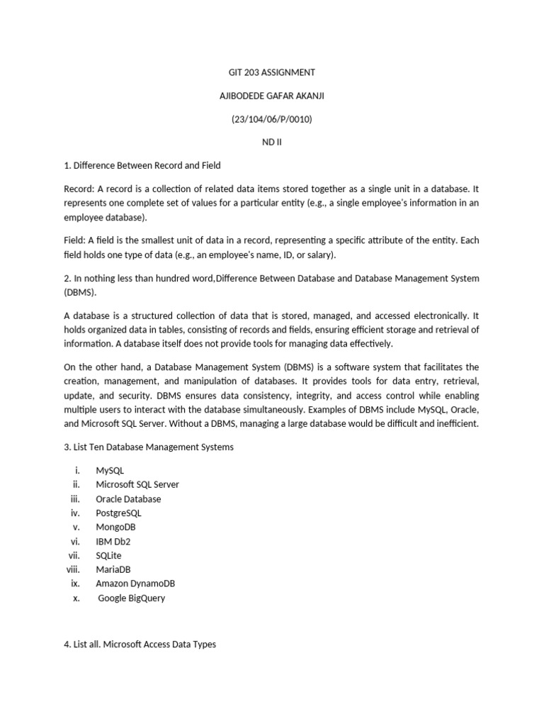 The document outlines key concepts in database management, including the definitions of records and fields, and the distinction between a database and a Database Management System (DBMS). It lists ten examples of DBMS and details various data types used in Microsoft Access. The document serves as a foundational guide for understanding data organization and management in databases.