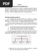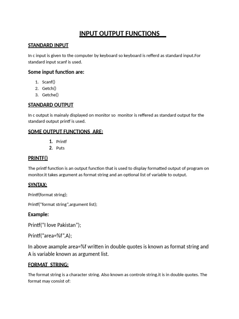 The document explains standard input and output functions in C programming, highlighting functions like scanf for input and printf for output. It details the syntax and usage of these functions, including format strings and argument lists. Additionally, it covers other input functions such as gets, getch, and getche, which handle character input in different ways.