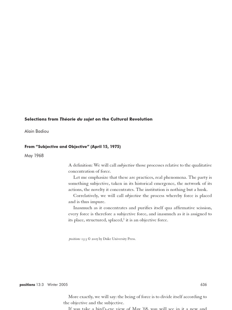 A definition: We will call subjective those processes relative to the qualitative concentration of force. Let me emphasize that these are practices, real phenomena. The party is something subjective, taken in its historical emergence, the network of its actions, the novelty it concentrates. The institution is nothing but a husk. Correlatively, we will call objective the process whereby force is placed and is thus impure. Inasmuch as it concentrates and purifies itself qua affirmative scission, every force is therefore a subjective force, and inasmuch as it is assigned to its place, structured, splaced,1 it is an objective force.