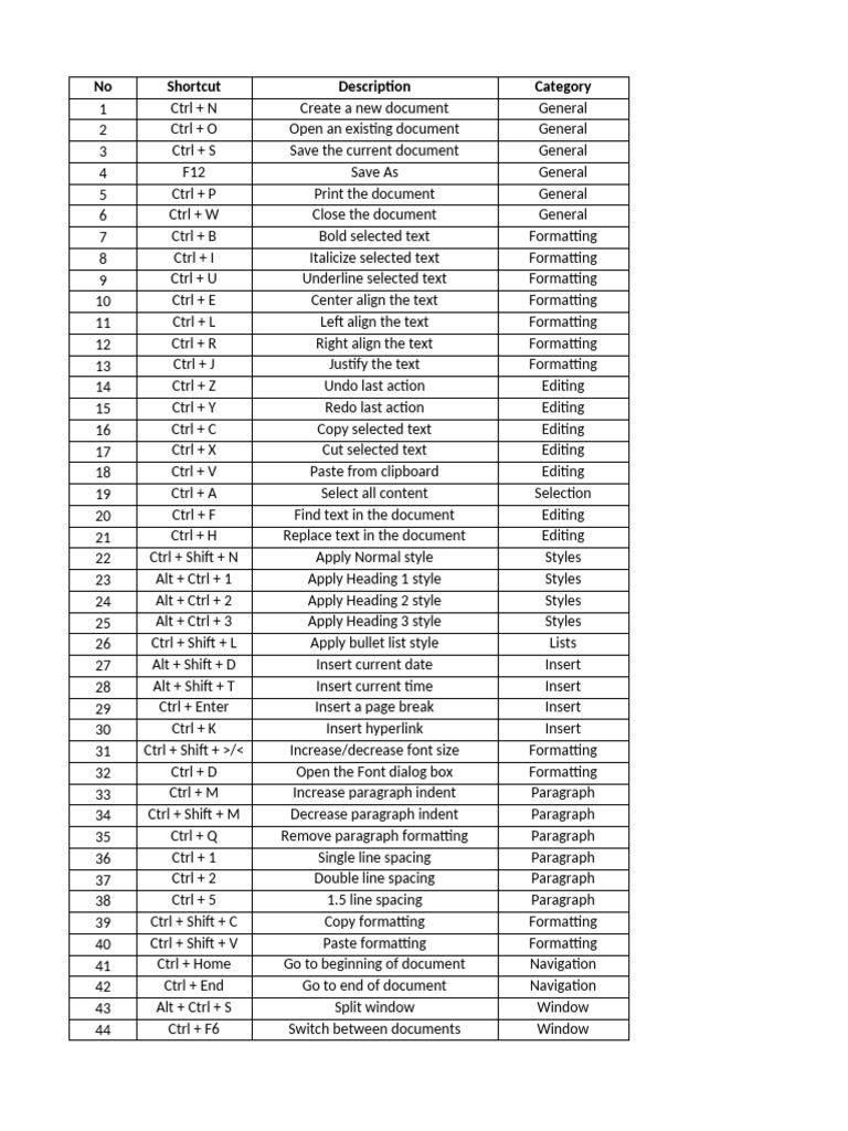 34 Ctrl + Shift + M Decrease paragraph indent Paragraph