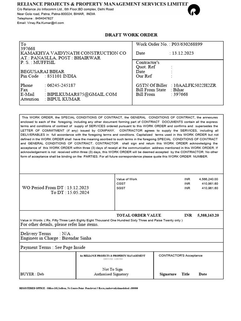 DRAFT WORK ORDER W.O.Number P03/630268899 Dt.13.12.2023