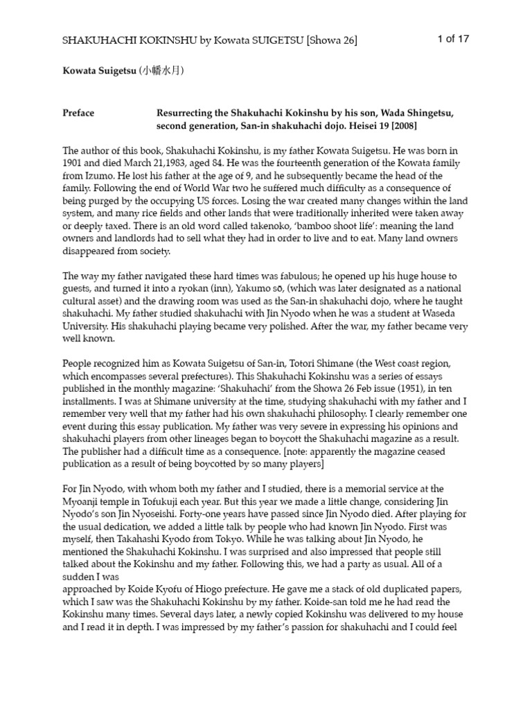 Preface Resurrecting the Shakuhachi Kokinshu by his son, Wada Shingetsu,